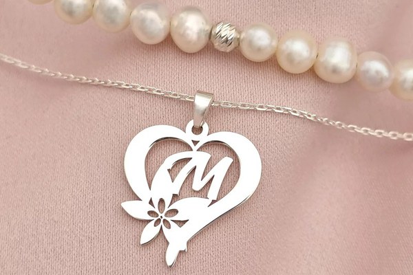 Colier Floarea Dragostei - Pandantiv inima cu initiala - Lantisor & Sirag de Perle - Argint 925