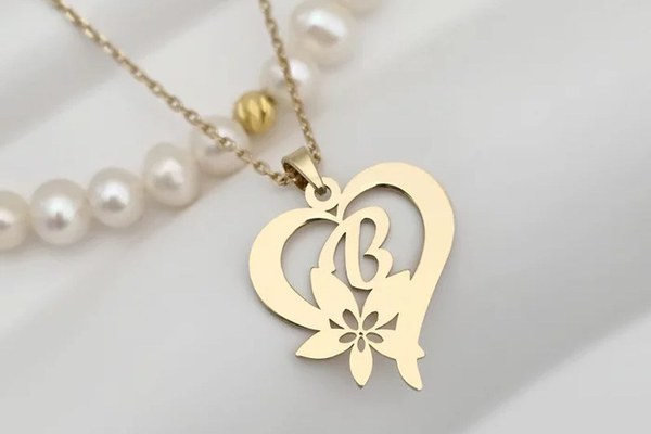 Colier Floarea Dragostei - Pandantiv inima cu initiala - Lantisor & Sirag de Perle - Argint 925 placat cu Aur Galben 18K
