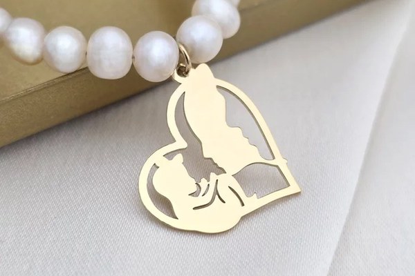 Colier Legatura Eterna - Inima cu Silueta Parintilor si Bebelus Fetita cu Fundita & Sirag de Perle - Argint 925 placat cu Aur Galben 18K