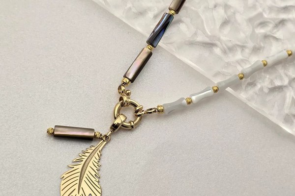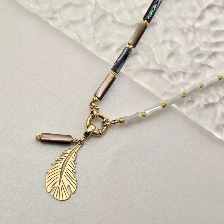 Colier Pana Aurie - Perle Cilindrice Metalizate & Gri & Bambus - Argint 925 placat cu Aur 18K