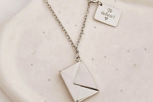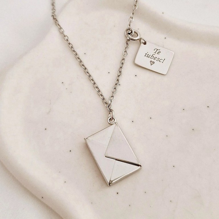 Va prezentam superbul nostru colier cu un mesaj secret ce creeaza un cadou personal, unic si deosebit. Colierul cu medalion plic 3D ce se deschide vine cu o placuta personalizata care poate fi ascunsa in interior sau prinsa de lantisor. Placuta este astfel asimilata cu o scrisoare gravata cu un cuvant semnificativ, un “Te iubesc!”, un nume drag sau o data speciala. Ofera persoanei iubite colierul cu un design fermecator si elegan. Acesta este o dovada a sentimentelor impartasite si o amintire frumoasa pentru o ocazie speciala: zi de nastere, aniversare, Ziua Indragostitilor, Craciun etc. Ce poate fi personalizat pe placuta: un cuvant + un simbol, o data, un nume sau doua nume scurte. DESPRE PRODUS: Bijuteria este realizata din Argint 925 si este Rodiata pentru o stralucire mai intensa si o rezistenta mai mare in timp. Dimensiune pandantiv plic: 17 x 12 mm (4 mm grosime); Dimensiunea mesajului secret: 13 x 11 mm (0,5 mm grosime). Lantisorul are lungimea totala de 46 cm: 41 cm + 5 cm prelungire. Colierul va ajunge la tine intr-o cutiuta de bijuterii eleganta, impreuna cu certificatul de calitate ce atesta autenticitatea materialelor folosite. Gramaj aproximativ ARGINT 925 : 6.70 grame Aceasta bijuterie personalizata este realizata de la zero pentru fiecare comanda in parte. Dupa plasarea si confirmarea comenzii incepe procesul ei de creatie: Realizare Design -> Taiere/Personalizare -> Finisare manuala -> Polish Final -> Ambalare -> Livrare! Datorita procesului de productie si a personalizarii bijuteriei dupa propria dorinta gramajul final al produsului poate fi diferit. Din acest motiv pe site este afisat gramajul obtinut prin catarirea produsului realizat in pozele de prezentare. Pretul produsului include pe langa costul gramului de Argint 925 si tot procesul de mai sus, necesar pentru realizarea unui produs cu adevarat special pentru tine. -- Toate produsele din Argint 925 comercializate de Chic Bijoux sunt marcate cu titlul Argintului· 925 · -- Dupa plasarea comenzii te va contacta un reprezentant al echipei Chic Bijoux pentru toate detaliile necesare personalizarii produsului.