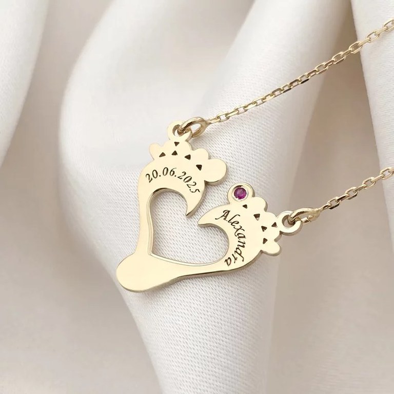 Lantisor cu pandantiv personalizat - contur picioruse in forma de inimioara - nume personalizat - Rubin - Lant link - Argint 925 placat cu Aur Galben 18K