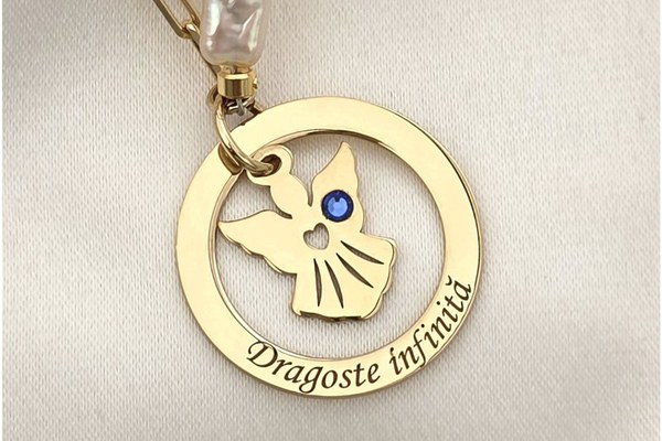Lantisor cu Perle - Medalion disc cu silueta de ingeras si inimioara decupata - Cristal swarovski - Model sirag de perle stick silver si bilute din Argint 925 placat cu Aur Galben 18K Acest lănțișor elegant combină armonios un șirag de perle stick silver cu biluțe din Argint 925 placat cu Aur Galben 18K. Medalionul disc cu silueta unui îngeraș și inimioară decupată simbolizează protecție și iubire. Cristalul Swarovski adaugă o notă subtilă de lux și lumină. Adaugă această bijuterie unică în colecția ta și poartă cu tine un simbol al grației și al eleganței divine! Caracteristici produs: Material: Argint 925 placat cu Aur Galben 18K Dimensiuni: Disc: 20 mm, Inger: 13x12 mm. Inchizatoare: carabina Decorare: Perle de cultura, lant cu zale, medalion personalizat cu ingeras. Greutate: Aproximativ 4.54 grame *** Ce inseamna perle de cultura ? O perla de cultura este o perla reala, autentica, produsa de o stridie sau o molusca. Procesul de cultivare este exact acelasi cu cel al unei perle naturale, cu exceptia faptului ca perlele naturale isi incep procesul in adancul oceanului, iar perlele de cultura incep cu putin ajutor din partea noastra, a oamenilor. Perlele de cultura sunt produse cu aceeasi calitate inalta ca perlele naturale, oferind fiecarei piese eleganta si stralucire. Procesul de productie Chic Bijoux: Aceasta bijuterie personalizata este realizata de la zero pentru fiecare comanda in parte. Dupa plasarea si confirmarea comenzii, incepe procesul ei de creatie: Realizare Design -> Taiere/Personalizare -> Finisare manuala -> Polish Final -> Ambalare -> Livrare! Datorita procesului de productie si a personalizarii bijuteriei dupa propria dorinta, gramajul final al produsului poate varia . Pe site este afisat gramajul obtinut prin cantarirea produsului din pozele de prezentare. Pretul include, pe langa costul gramului de Argint 925 , intregul proces de productie si personalizare, garantand un produs unic si special, creat doar pentru tine. De ce sa alegi Chic Bijoux? Fiecare bijuterie Chic Bijoux este realizata cu pasiune, respectand cele mai inalte standarde de calitate: Bijuterii unice realizate manual, personalizate pentru fiecare client. Ambalaj premium, perfect pentru a fi oferit cadou. Garantia calitatii: din 2010 producem bijuterii din metale pretioase de cea mai bună calitate folosind tehnologie de ultimă generație și finisare manuală. Dupa plasarea comenzii, vei fi contactat de un reprezentant al echipei Chic Bijoux pentru toate detaliile necesare personalizarii produsului si a ne asigura ca produsul final corespunde asteptarilor tale. Toate produsele din Argint 925 comercializate de Chic Bijoux sunt marcate cu titlul Argintului · 925.
