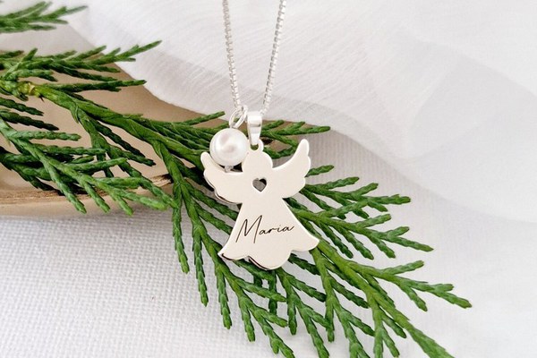 Lantisor festiv - Iubire Angelica - Pandantiv inger cu inima decupata, nume si charm perla - Argint 925
