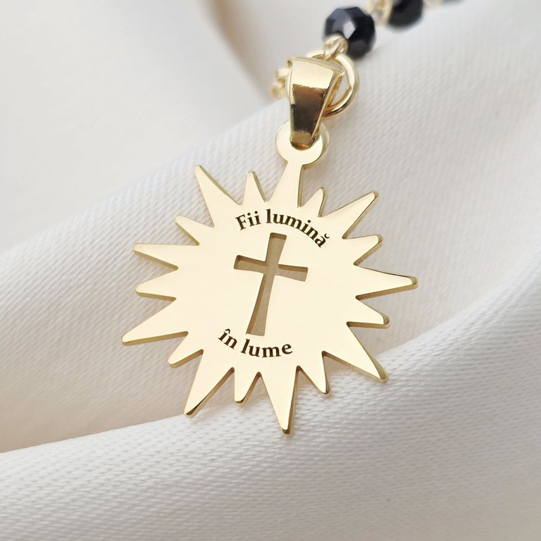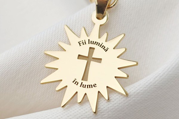 Lantisor Fii lumina in lume - Bijuterie cu Har - Argint 925 placat cu Aur Galben 18K Lănțișorul „Fii Lumină în Lume” transmite un mesaj puternic, inspirând bunătate și autenticitate în fiecare zi. Realizat din Argint 925 placat cu aur galben 18K, se remarcă prin strălucirea sa caldă și designul delicat. Este accesoriul ideal pentru a-ți exprima valorile și a adăuga o notă subtilă de eleganță oricărei ținute. Alege-l acum și lasă-ți lumina interioară să strălucească! Caracteristici produs: Material: Argint 925 placat cu Aur Galben 18K Dimensiuni pandantiv: 15 mm Lungime colier: 40 cm Inchizatoare: carabina Decorare: Lant cu bilute nerge + medalion gravat si simbol cruce Greutate: Aproximativ 5.00 grame Procesul de productie Chic Bijoux: Aceasta bijuterie personalizata este realizata de la zero pentru fiecare comanda in parte. Dupa plasarea si confirmarea comenzii, incepe procesul ei de creatie: Realizare Design -> Taiere/Personalizare -> Finisare manuala -> Polish Final -> Ambalare -> Livrare! Datorita procesului de productie si a personalizarii bijuteriei dupa propria dorinta, gramajul final al produsului poate varia . Pe site este afisat gramajul obtinut prin cantarirea produsului din pozele de prezentare. Pretul include, pe langa costul gramului de Argint 925 , intregul proces de productie si personalizare, garantand un produs unic si special, creat doar pentru tine. De ce sa alegi Chic Bijoux? Fiecare bijuterie Chic Bijoux este realizata cu pasiune, respectand cele mai inalte standarde de calitate: Bijuterii unice realizate manual, personalizate pentru fiecare client. Ambalaj premium, perfect pentru a fi oferit cadou. Garantia calitatii: din 2010 producem bijuterii din metale pretioase de cea mai bună calitate folosind tehnologie de ultimă generație și finisare manuală. Dupa plasarea comenzii, vei fi contactat de un reprezentant al echipei Chic Bijoux pentru toate detaliile necesare personalizarii produsului si a ne asigura ca produsul final corespunde asteptarilor tale. Toate produsele din Argint 925 comercializate de Chic Bijoux sunt marcate cu titlul Argintului · 925.