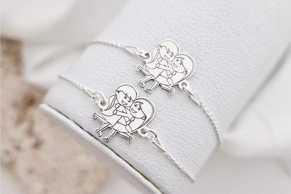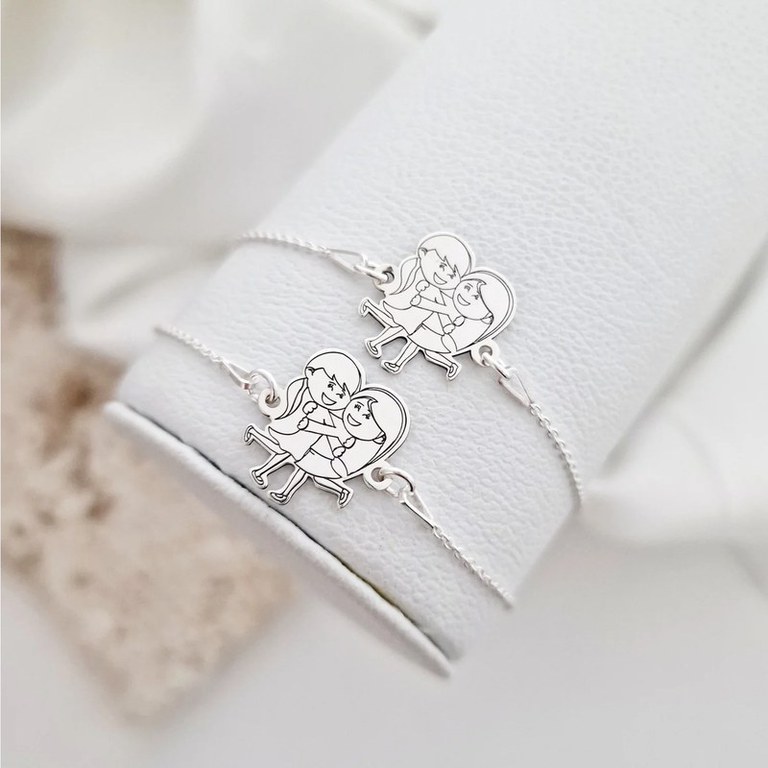 Set 2 bratari personalizate - Model decupat - 2 fete/surori/prietene imbratisate - Argint 925 - lantisor