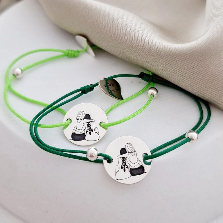 Set 2 bratari personalizate - Sisters Forever - Banut 15 mm cu 2 siluete imbratisate Surori/Prietene - Bilute 4 mm - Argint 925 - Snur reglabil