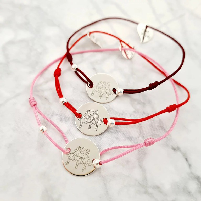 Set 3 bratari personalizate - Inima Soul Sisters- Banut 15 mm cu 3 siluete cu rochite Surori/Prietene - Bilute 4 mm - Argint 925 - Snur reglabil