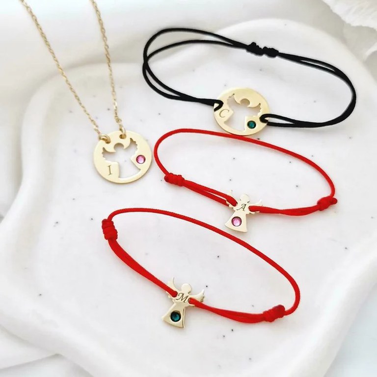 Set Bijuterii Familie Personalizate – 3 Bratari si 1 Lantisor – Ingerasi cu Cristale Swarovski – Argint 925 Placat cu Aur 18K – Snur Reglabil