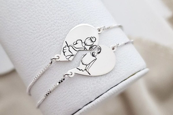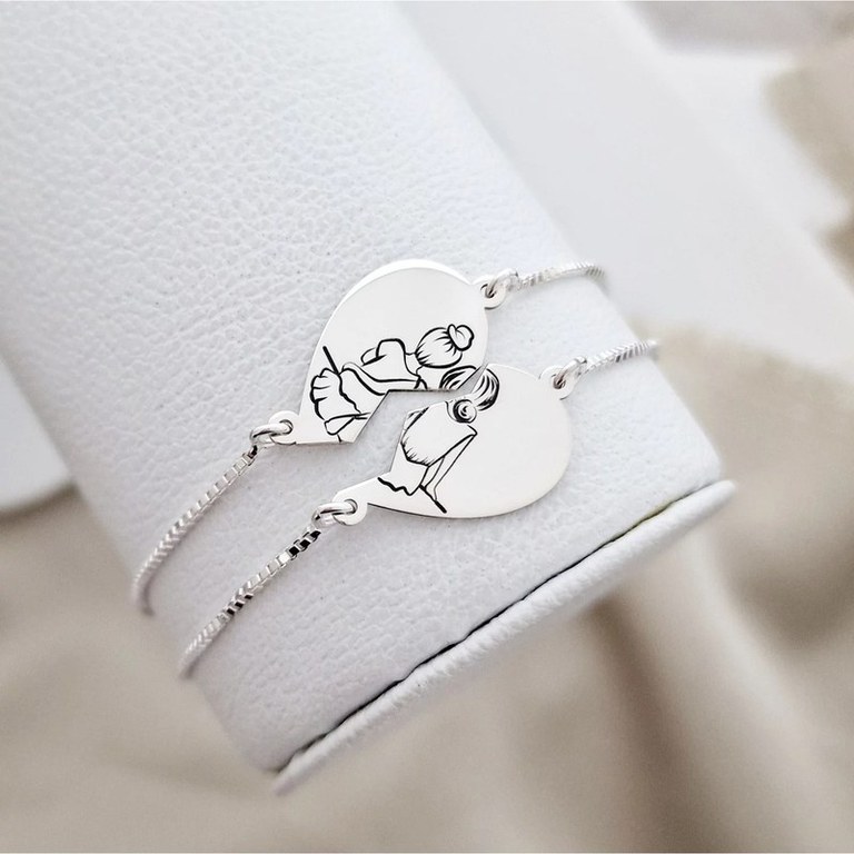 O bratara pentru tine si una pentru sora sau cea mai buna prietena a ta. Purtati-le zi de zi si vor capta toate amintirile voastre. Fiecare bratara reprezinta o bucata de puzzle din inima celor doua surori/prietene. Bratara este de tip glisanta si are o marime reglabila putand sa fie fixata pe mana usor, cu ajutorul unei bilute care se deplaseaza pe lungimea acesteia, blocand-o la circumferinta dorita. DESPRE PRODUS: Bijuteriile sunt creatie din Argint 925. Dimensiunea inimii este de 20 x 20 mm, iar o bucata de puzzle are dimensiunea de 10 x 20 mm. Pandantivele sunt atasate de un lantisor glisant ajustabil. Gravarea unui nume, a unei date sau a unui mesaj scurt pe spatele pieselor este gratuita. Pretul afisat este pentru ambele bratari si gravarea inclusa. Gramaj aproximativ ARGINT 925: 5.10 grame Aceasta bijuterie personalizata este realizata de la zero pentru fiecare comanda in parte. Dupa plasarea si confirmarea comenzii incepe procesul ei de creatie: Realizare Design -> Taiere/Personalizare -> Finisare manuala -> Polish Final -> Ambalare -> Livrare! Datorita procesului de productie si a personalizarii bijuteriei dupa propria dorinta gramajul final al produsului poate fi diferit. Din acest motiv pe site este afisat gramajul obtinut prin catarirea produsului realizat in pozele de prezentare. Pretul produsului include pe langa costul gramului de Argint 925 si tot procesul de mai sus, necesar pentru realizarea unui produs cu adevarat special pentru tine. Toate produsele din Argint 925 comercializate de Chic Bijoux sunt marcate cu titlul Argintului· 925 · Dupa plasarea comenzii vei fi contactat de un reprezentant din echipa Chic Bijoux pentru toate detaliile necesare personalizarii produsului.