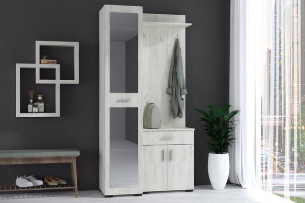 Dimensiuni : Lungime 100 x Adancime 42 x Inaltime 200 cm Material : Corp: Pal melaminat K001 Front: Pal melaminat K001 Caracteristici : 3 agatatori ( DUBLE ) Oglinda Polite 1 sertar Produsul se livreaza in pachete, cu schita de montaj...