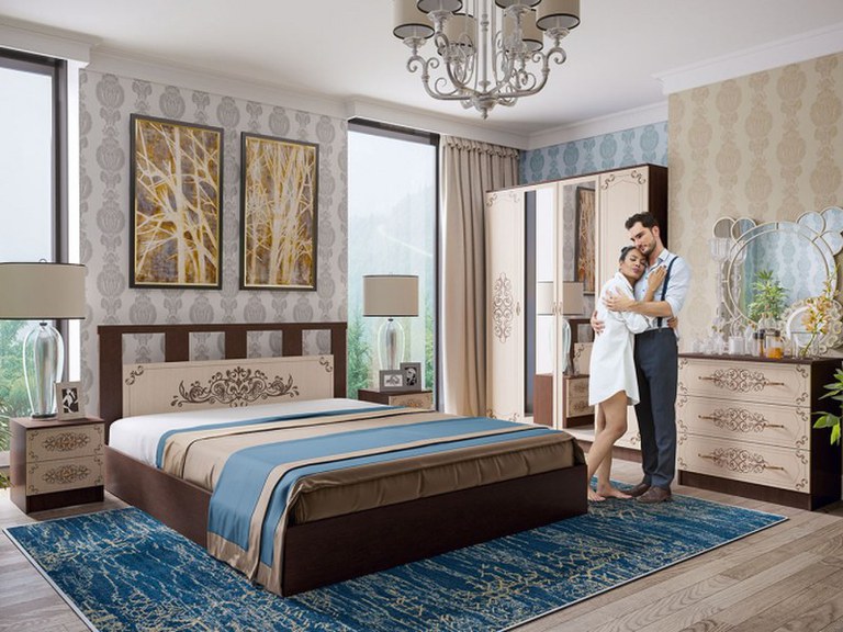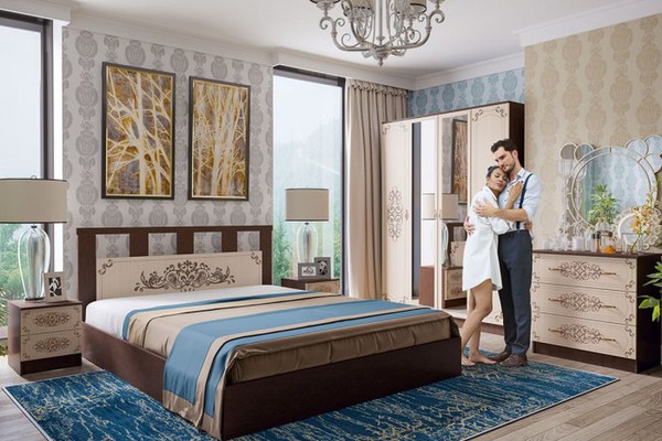 Material : Corp: PAL Melaminat Wenge Front: PAL Melaminat Mesteacan Dimensiuni Corpuri : Dulap 4 Usi cu rafturi si bara haine ( x 1 buc ): Lungime 160 x Adancime 54 x Inaltime 222cm; Pat 2 persoane ( x 1 buc ) : Lungime 165 x Adancime 203 x Inaltime...