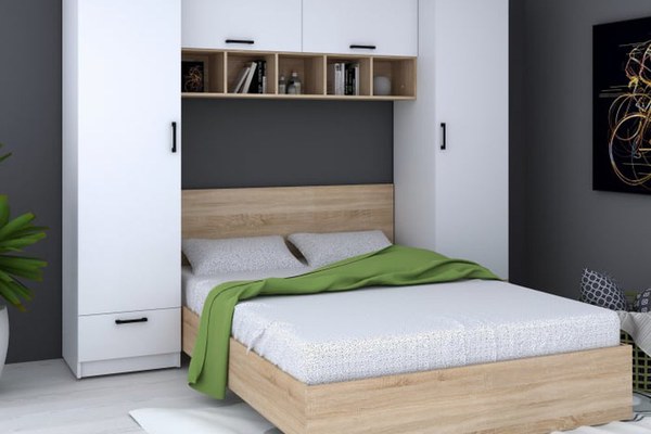 Set de mobilier pentru dormitor, realizat din PAL melaminat, cu design contemporan și finisaj în combinație Alb și Sonoma. Setul este conceput pentru amenajarea funcțională a dormitorului, incluzând corpuri de depozitare și pat, într-o structură...
