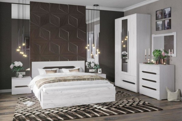 MATERIAL: Corp: Pal melaminat K001 Front: Pal melaminat K001 DIMENSIUNI CORPURI: Dulap 3 usi cu rafturi si bara de haine (x 1 buc): Lungime 120 cm x Adancime 50 cm x Inaltime 220 cm Pat 2 persoane (x 1 buc): Lungime 164 cm x Adancime 204 cm x Inaltime...