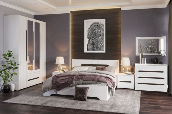 MATERIAL: Corp: Pal melaminat K001 Front: Pal melaminat K001 DIMENSIUNI CORPURI: Dulap 4 usi cu rafturi, sertare si bara de haine (x 1 buc): Lungime 160 cm x Adancime 50 cm x Inaltime 220 cm Pat 2 persoane (x 1 buc): Lungime 164 cm x Adancime...