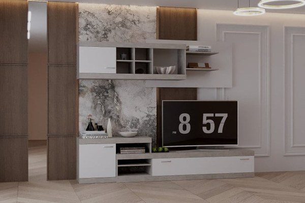Material: Corp: Pal melaminat Gri ciment Front: Pal melaminat Alb Dimensiuni: Lungime 253 x Adancime 42 x Inaltime 200cm Spatiu TV: Lungime 134 x Inaltime 100cm Produsul se livreaza in pachete, cu schita de montaj si feroneria necesara...
