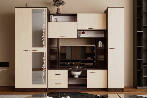Set de mobilă living cu aspect modern, realizat din PAL melaminat în combinație Wenge și Mesteacăn, cu fronturi decorative prevăzute cu oglindă cu model. Configurația este gândită pentru depozitare practică și evidențierea zonei TV, oferind...