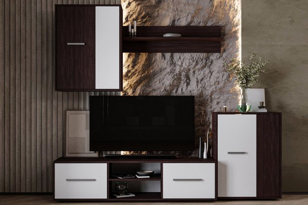Set de mobilier pentru living, realizat din PAL melaminat, cu design modern și combinație cromatică Wenge Alb, potrivit pentru spații bine organizate și aerisite. Material Componentă Specificație Corp PAL melaminat 16mm Wenge Front PAL melaminat...