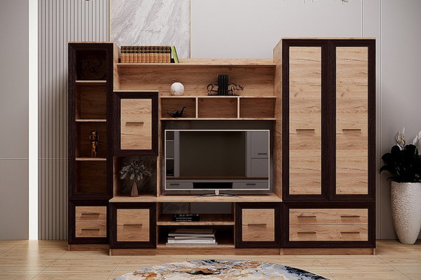 Material : Corp : Pal melaminat K003 Front : Pal melaminat Stejar K003 + Bagheta Wenge Dimensiune totala : Lungime 300 x Adancime 52 x Inaltime 210cm Spatiu TV : L 110 x H 87 cm Produsul se livreaza in pachete, cu schita de montaj...