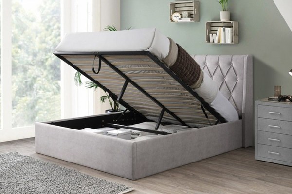Pat tapitat Prestige 1 cu somiera metalica rabatabila si spatiu de depozitare Crem 160x200 cm