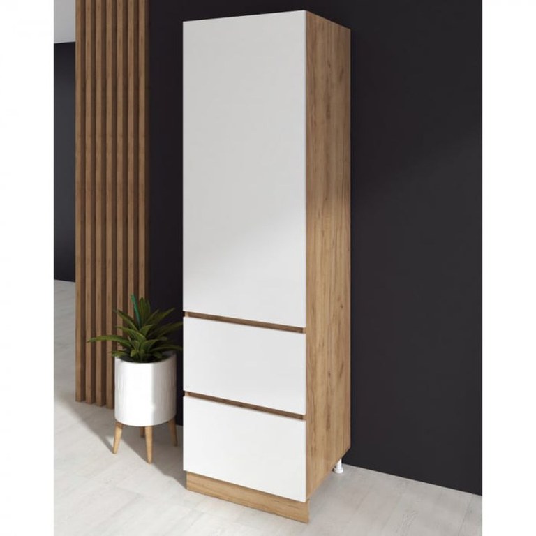 Dimensiuni: Lungime 60 x Adancime 58 x Inaltime 215cm Material : Corp : Pal melaminat Stejar K003 Front : MDF Alb Caracteristici: Polite o usa doua sertare Front din MDF acril Produsul se livreaza in pachet ( 1 colet ), cu schita...