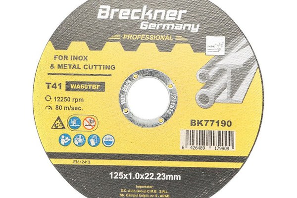 Disc debitat inox Breckner Germay Diametru exterior 125 mm Diametru interior 22.23 mm Grosime 1.0 mm Forma T41 Utilizare Inox Turatie max 12250 rpm