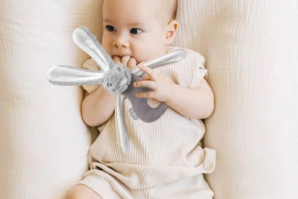 Jucarie zornaitoare bebelusi BabyJem, Iepuras din plus, 3 luni+, Gri