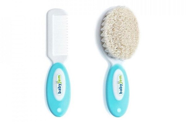 Setul de ingrijire a parului pentru bebelusi BabyJem include un pieptene cu varfuri rotunjite si o perie realizata din par natural si fin.