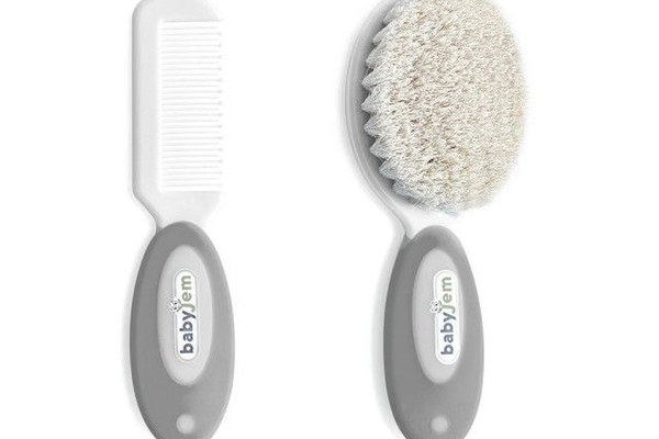 Setul de ingrijire a parului pentru bebelusi BabyJem include un pieptene cu varfuri rotunjite si o perie realizata din par natural si fin.