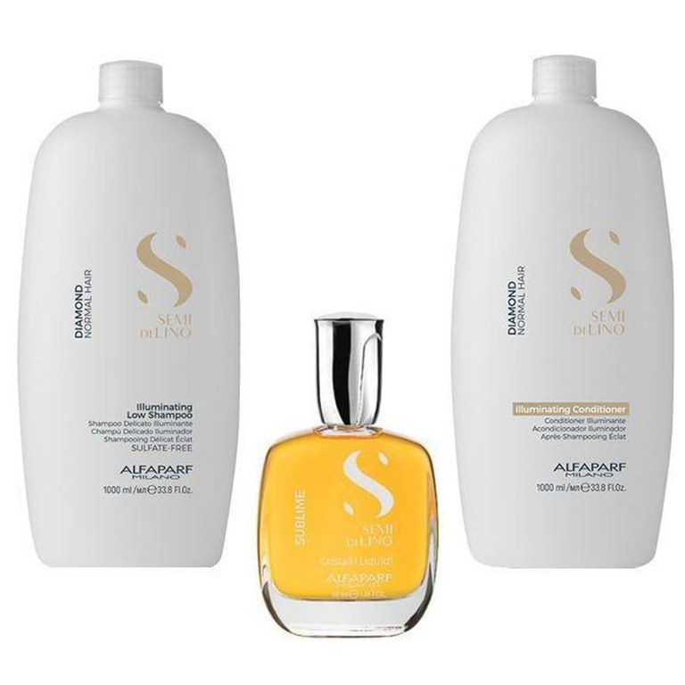 Pachet de Stralucire pentru Par Normal Alfaparf Semi di Lino Diamond Illuminating - Sampon 1000ml, Balsam 1000ml, Ser 50ml
