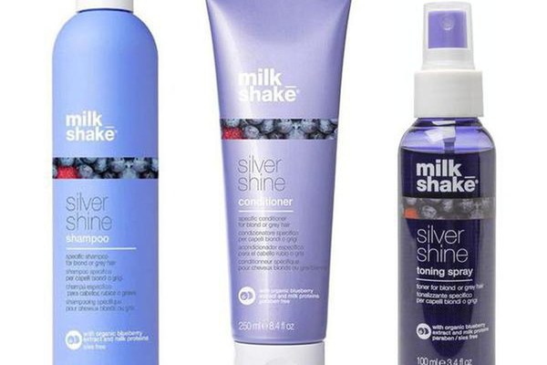 Pachet pentru Par Blond, Gri sau Alb - Milk Shake Silver Shine: Sampon, 300 ml + Balsam, 250 ml + Spray Nuantator pentru Neutralizarea Tonurilor de Galben, 100 ml