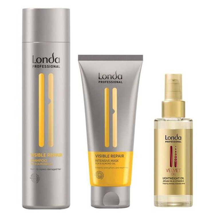 Pachet Reparator - Londa Professional Visible Repair: Sampon 250 ml, Masca 200 ml, Ulei de Argan 30 ml - Produs din sectiunea Produse Cosmetice, categoria Pachete Promo, subcategoria la pretul de 84 Lei; Producator: Londa Professional