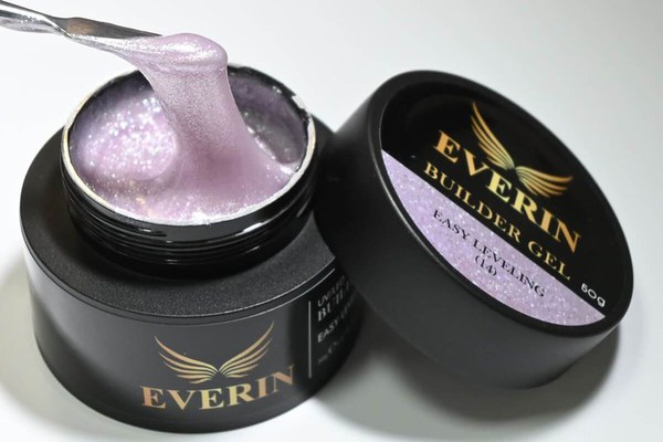 Everin Builder Gel Easy Leveling 14 – Gel autonivelant profesional 50g, nuanță Crystal Lilac Shimmer. Textură medie, sclipici irizat și autonivelare perfectă. Ideal pentru manichiuri elegante și rezistente.