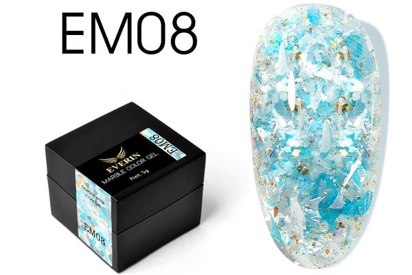 Everin Marble Color Gel EM08 – gel profesional cu efect de marmură albastru-acvatic și reflexii aurii perlate. Textură autonivelantă, luciu intens, polimerizare rapidă și durabilitate ridicată. Ideal pentru manichiuri de vară, marine sau artistice.