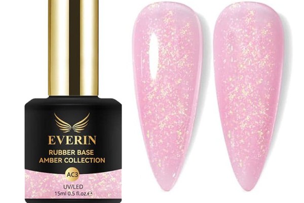 Rubber Base Everin Amber Collection 03 – Bază Cauciucată Roz Pastel cu Fulgi Aurii Irizați, HEMA & TPO Free, 15ml
