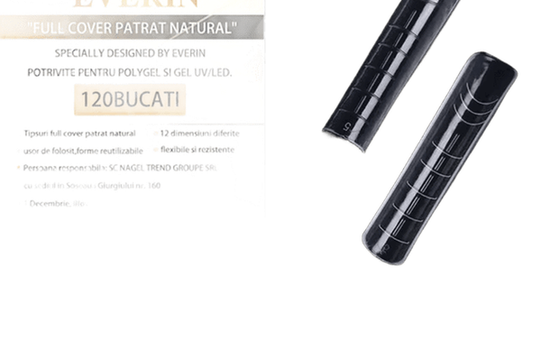 Tipsuri Full Cover Everin Pătrat Natural, set 120 bucăți, 12 mărimi. Ideale pentru extensii rapide cu gel, acryl sau polygel, uz profesional.