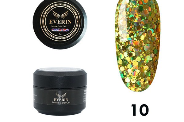 Twinkle Color Gel EVERIN 5ml – 10 este un gel color profesional în nuanță auriu-verzui cu sclipici holografic multicolor. Ideal pentru manichiuri elegante, moderne și rezistente.