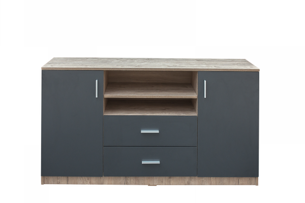 Comoda LUXOR, 2 usi, 2 sertare, corp stejar sherwood, fronturi gri, 140x40x80 cm