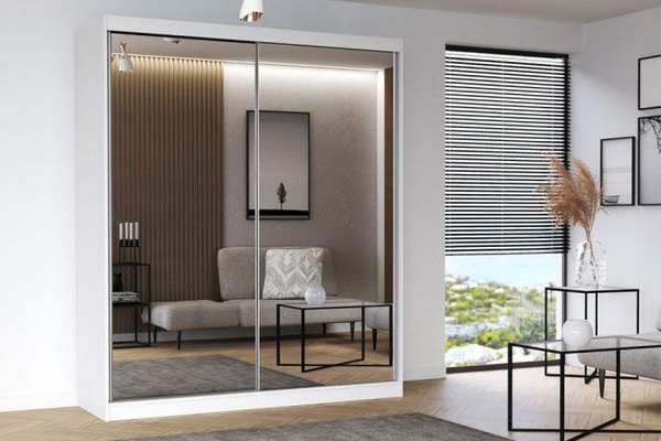Dulap MULTI 20, usi glisante, oglinda, 6 rafturi, bara de haine, alb, 183x61x218 cm