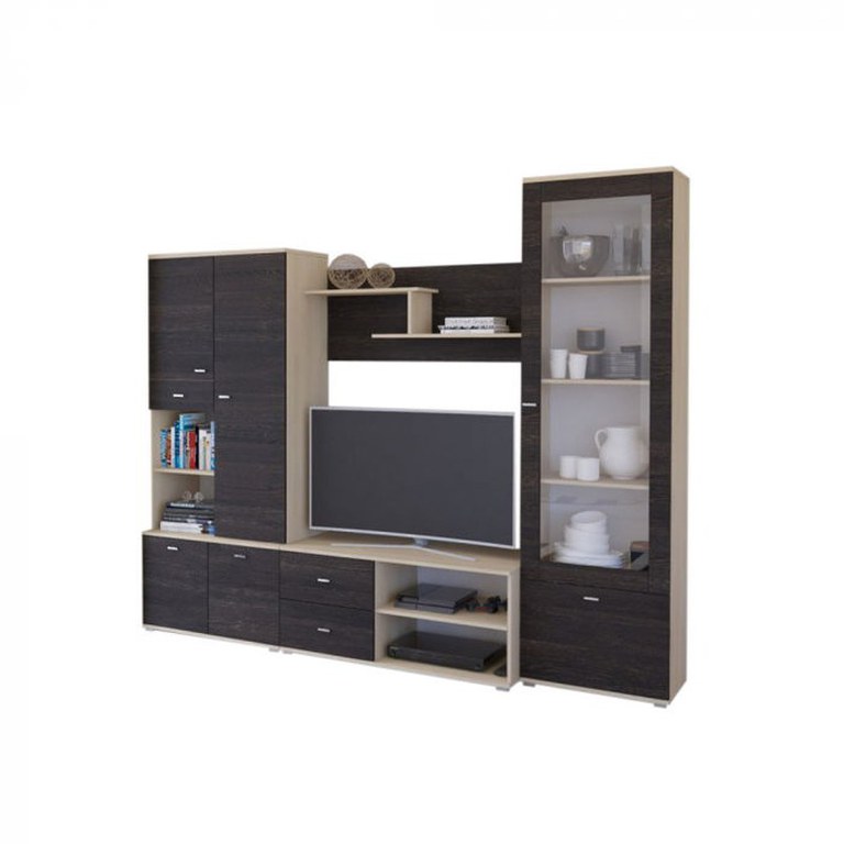 Dimensiuni produs (gabarit): Lungime: 250 cm Adâncime: 51 cm Înălțime: 201 cm Componență: Biblioteca (L x l x h): 80x47x 186,5 cm Măsuță RTV (L x l x h): 110x47x48 cm Poliță RTV (L x l x h): 110x25x45 cm Vitrină...