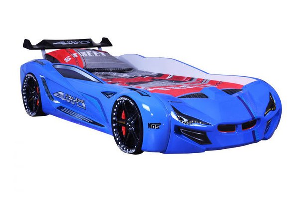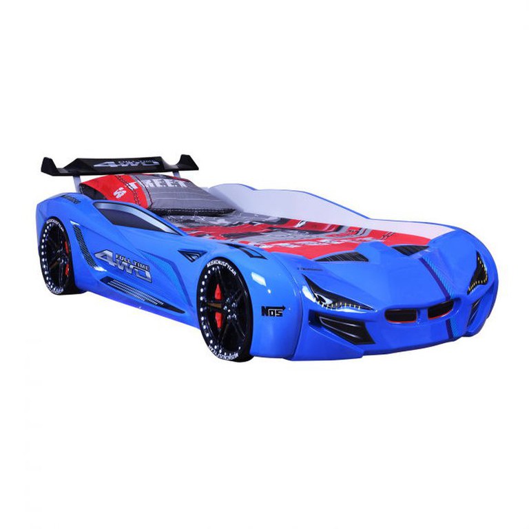 Pat pentru copii masina MVN1, cu sunet, telecomanda si lumini LED, albastru, 90x190 cm