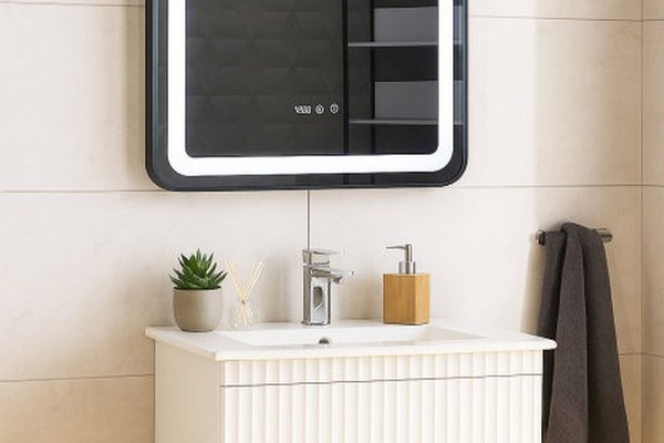 Set Baza front MDF cu Lavoar si Oglinda cu iluminare LED, seria 009, suspendata, cu sertare, 70 cm, alb