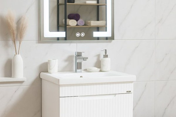 Set Baza front MDF cu Lavoar si Oglinda cu iluminare LED, seria 733, cu sertare, montat, 60 cm, alb