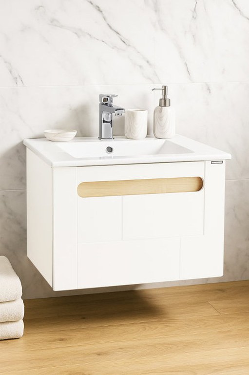 Set Baza front MDF si Lavoar seria 032, suspendata, cu sertar, montat, 60 cm, alb + sonoma