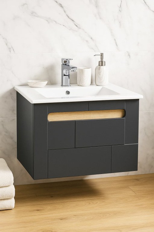 Set Baza front MDF si Lavoar seria 032, suspendata, cu sertar, montat, 60 cm, antracit + sonoma