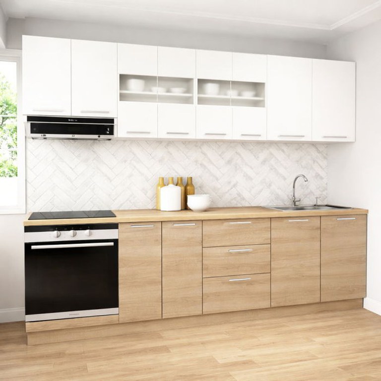 Set bucatarie GERMANIA 260 cm, 8 corpuri, corp cuptor, 3 sertare, blat gros, sonoma + alb