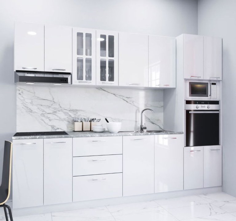 Set bucatarie IRIS 260 cm, 7 corpuri, corp cuptor + microunde, blat termorezistent, fronturi MDF, alb