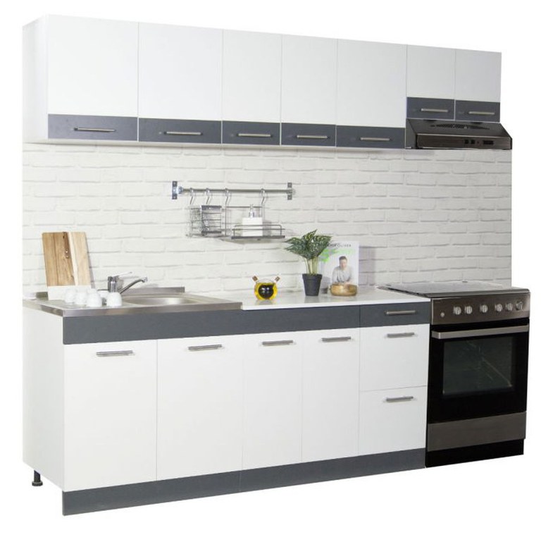 Set bucatarie SARONA 240 cm, 7 corpuri, corp hota, blat PAL, alb + antracit