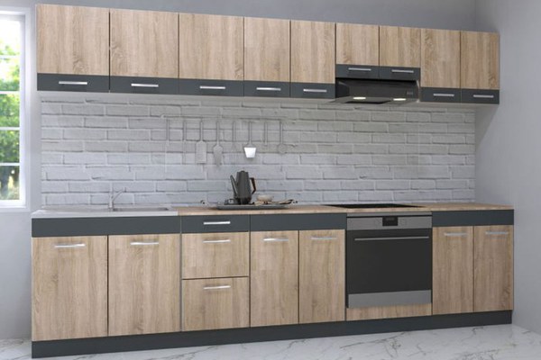 Set bucatarie SARONA 300 cm, 10 corpuri, blat PAL, sonoma + antracit