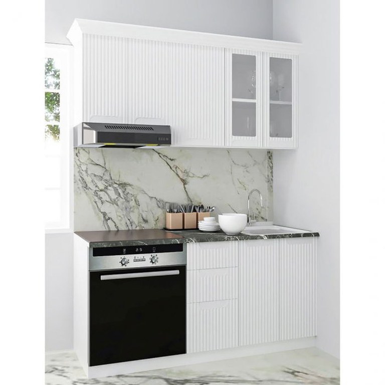 Set bucatarie SPACE 160 cm, 6 corpuri, corp cuptor, cu sertare, blat termorezistent, fronturi MDF, alb rustic